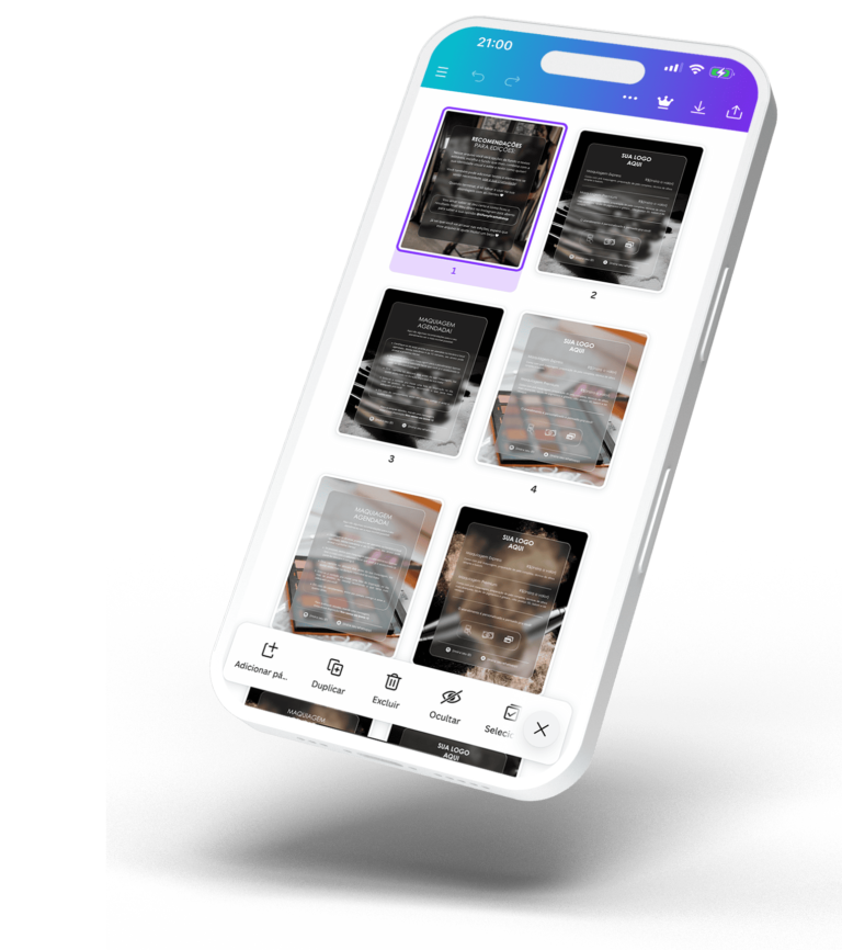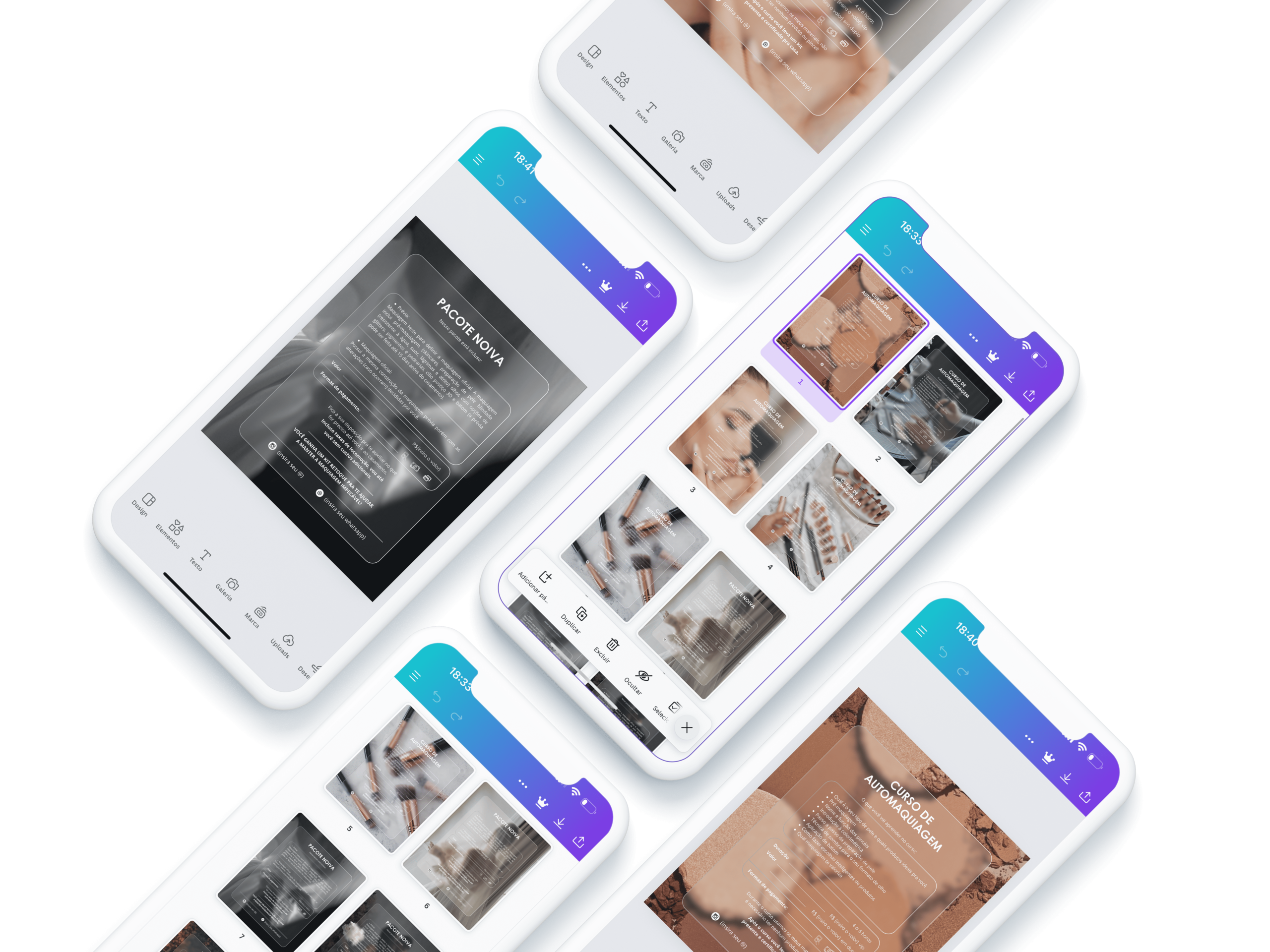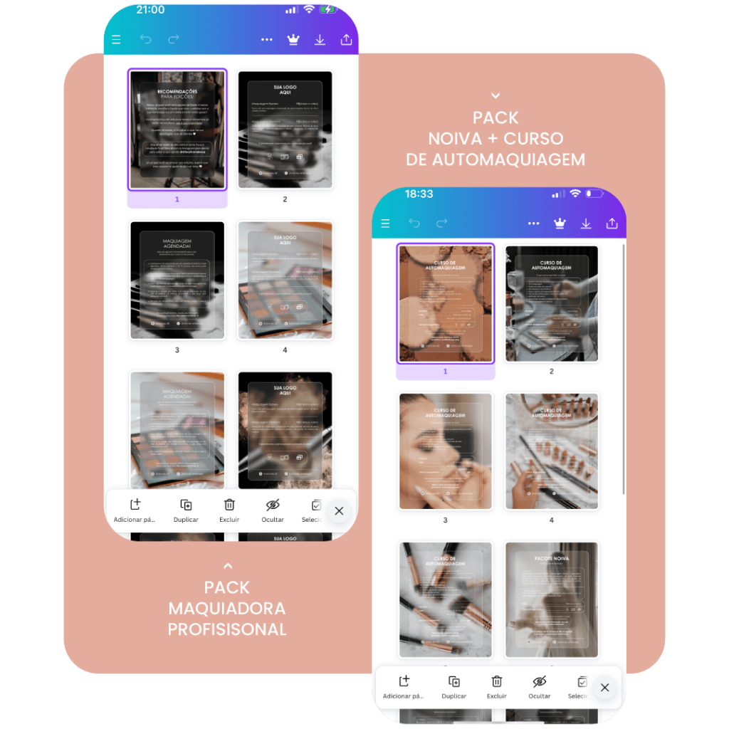 O Pack Noiva + Curso de Automaquiagem oferece uma variação de 5 flyers cada modelo com fundos diferentes para você escolher qual se encaixa melhor com a sua estratégia atual.